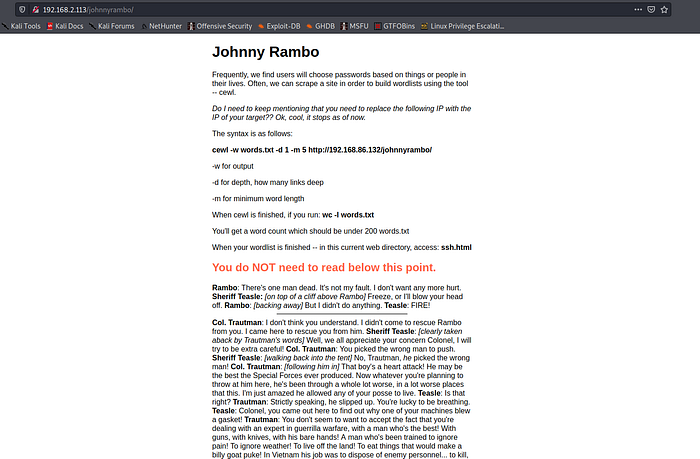 cewl -w words.txt -d 1 -m 5 http://192.168.2.113/johnnyrambo/