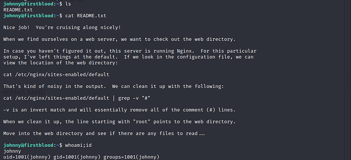 johnny@firstblood:/$ cat /etc/nginx/sites-enabled/default | grep -v “#”