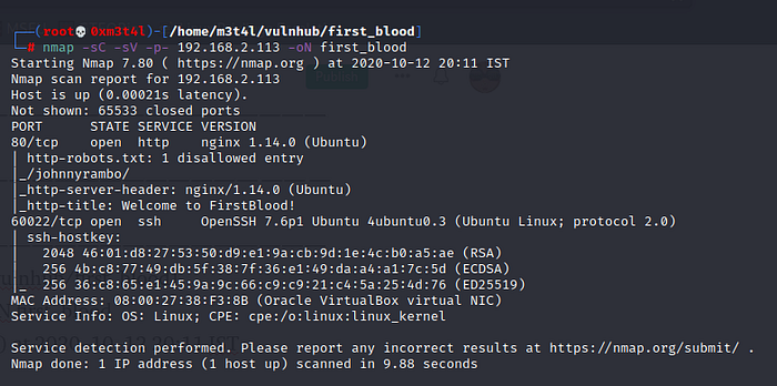 nmap -sC -sV -p- 192.168.2.113 -oN first_blood