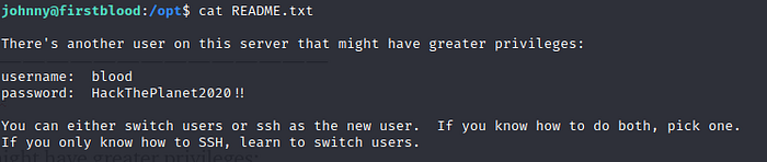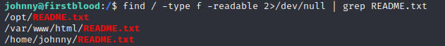 johnny@firstblood:/$ find / -type f -readable 2>/dev/null | grep