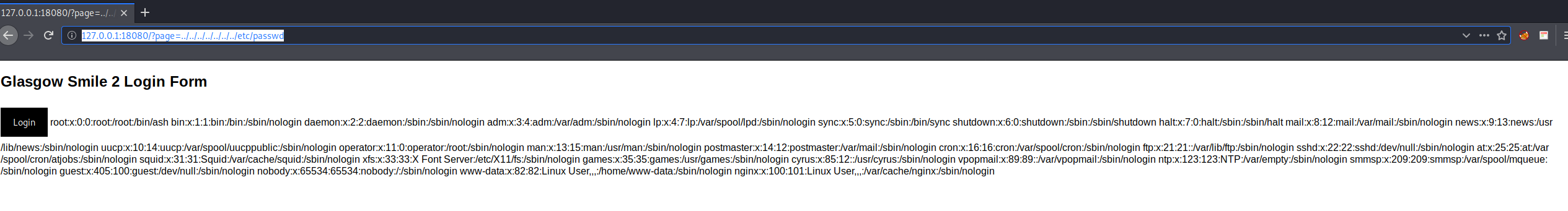 Local file inclusion http://127.0.0.1:18080/?page=../../../../../../../etc/passwd: