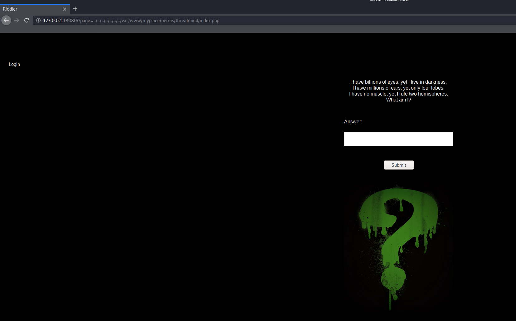 Request /var/www/myplace/hereis/threatened/index.php with LFI again: