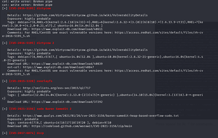 Looking at the result, we can see machine is vulnerable to multiple exploits.