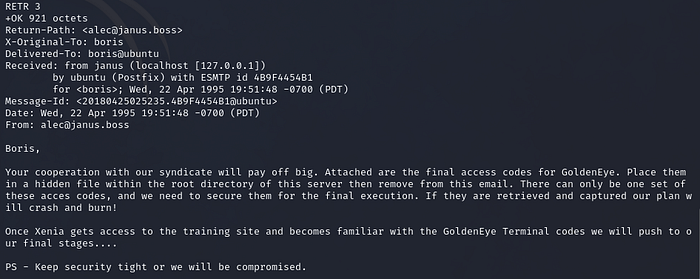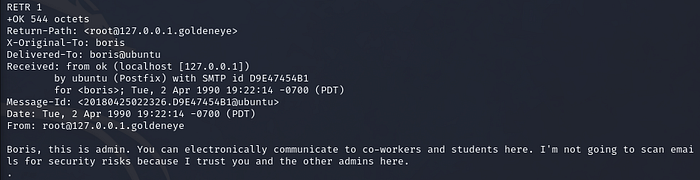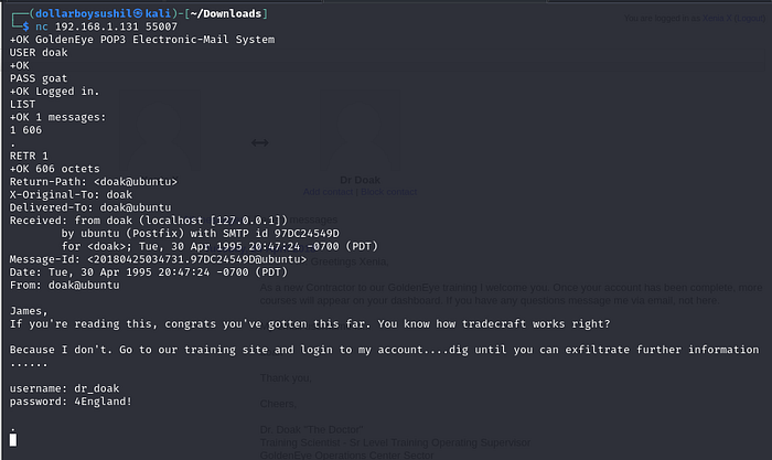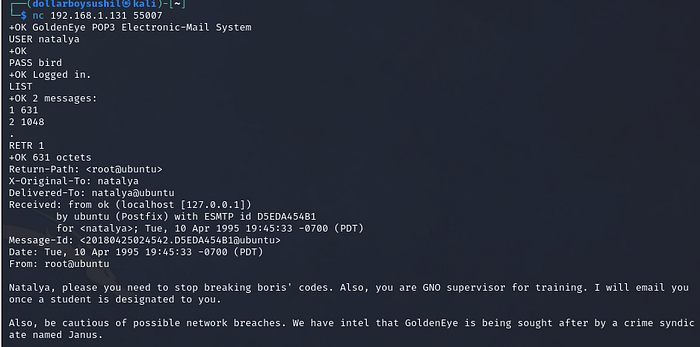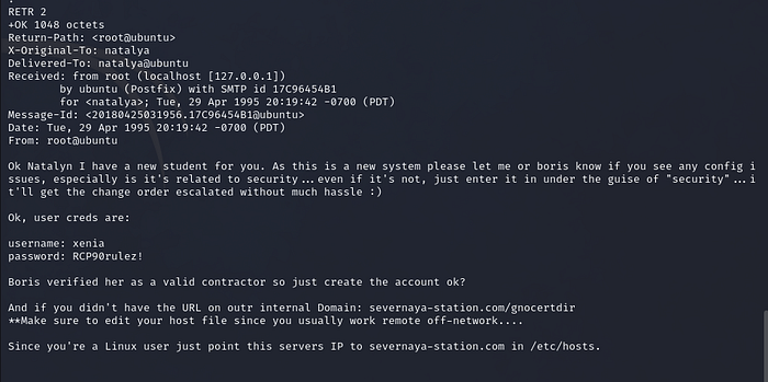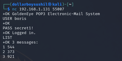 With hydra successful bruteforce we now have two valid credentails for pop3 . lets login and see if we get anything.