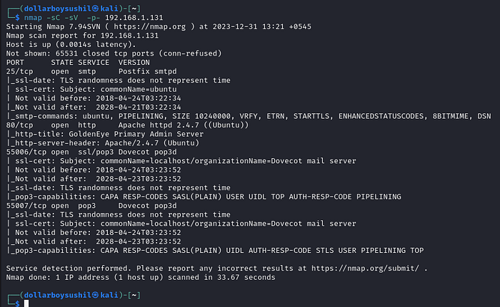 nmap -sC -sV 192.168.1.142-sC for default scripts,-sV for version enumeration and -p- to scan all ports.