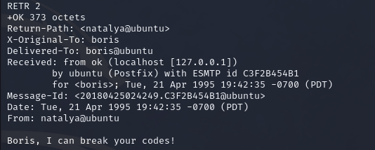 Currently we know two users Natalya and Boris . With this usernames we can try to bruteforce pop3 password using hydra tool