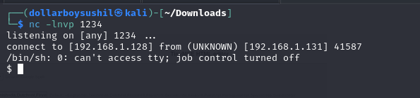 Use python command:python -c ‘import pty;pty.spawn(“/bin/bash”)’ to upgrade the shell.