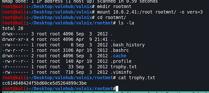 mkdir rootmntmount 10.0.2.31:/root rootmnt/ -o vers=3cd rootmnt/ls -lacat trophy.txt