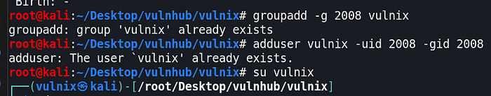 groupadd -g 2008 vulnixadduser vulnix -uid 2008 -gid 2008su vulnix