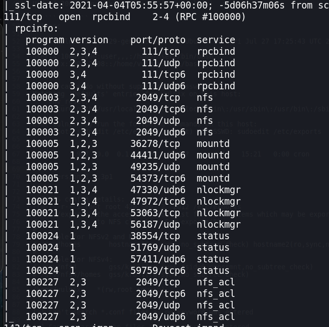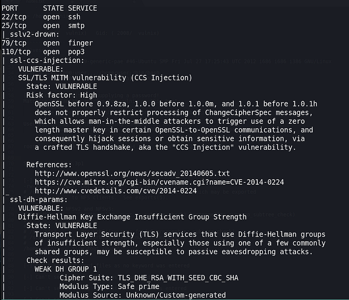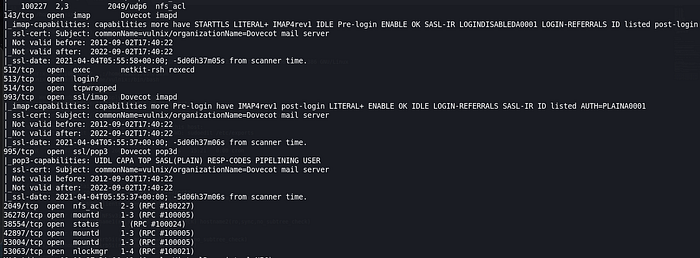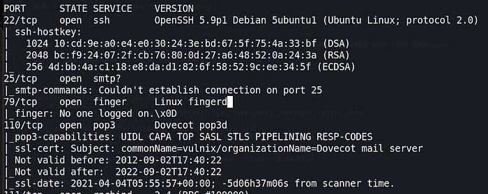 nmap -A -p22,25,79,110,111,143,512,513,514,993,995,2049,36278,38554,42897,53004,53063 10.0.2.35There’re many open ports. In summary, there’re 5 services: SSH, SMTP-related, finger, netkit-rsh, and NFS-related.