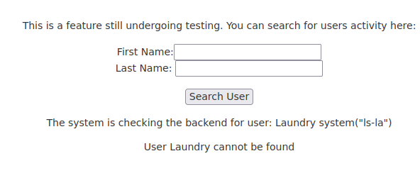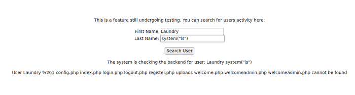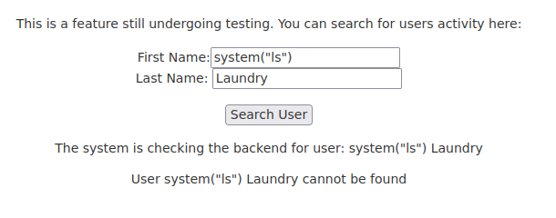 Next, we try to use the user search feature by inputting a command such as system(“ls”). First, we try to input the first name. The result is that the system displays what we input.