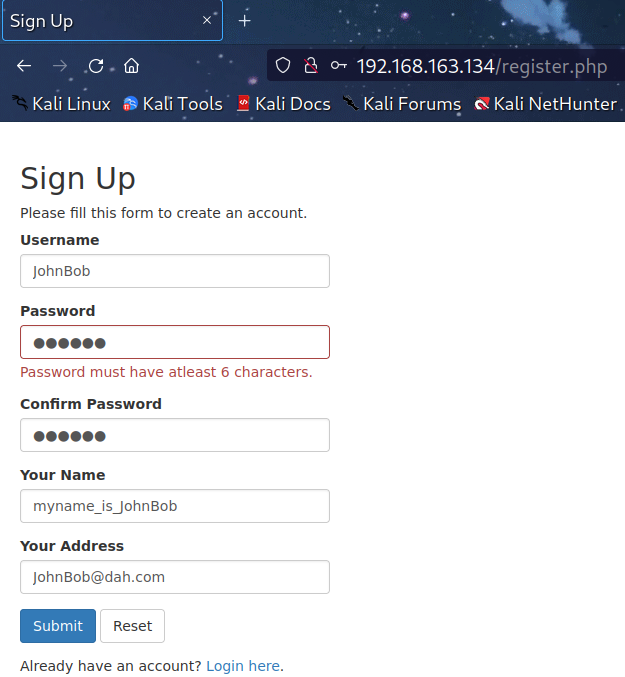 Immediately, let’s sign up in register.php to create a username and password so we can input them in login.php.