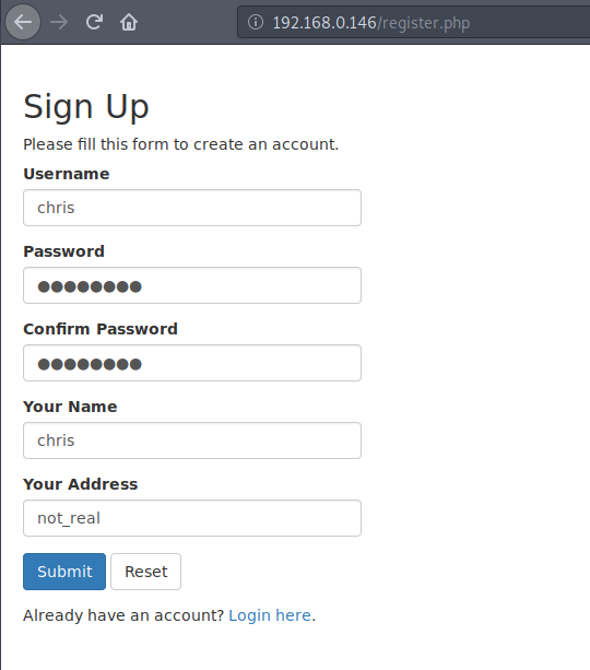 I used Parrot OS on bare metal for this tutorial, so if you are using Kali, some of the commands may be slightly different, and your shell prompt will most likely not match mine exactly. The HackMe machine is running in VMWare. The exploitation will be basically the same though even if your setup doesn’t match this exactly. Upon starting the HackMe Machine we are greeted with a simple login page, so the first step will be obtaining the IP Address of the local machine.
