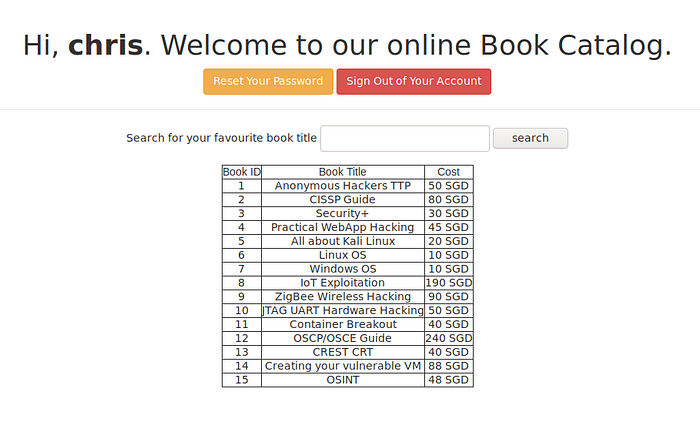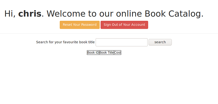 Here I am greeted with a standard login page, where I make an account using chris:password. This works and redirects me to a book search page.
