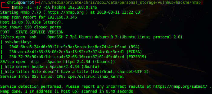 Now that I know the IP address I am looking for, I will run a port scan on the specific box with nmap -sC -sV -oA hackme 192.168.0.146