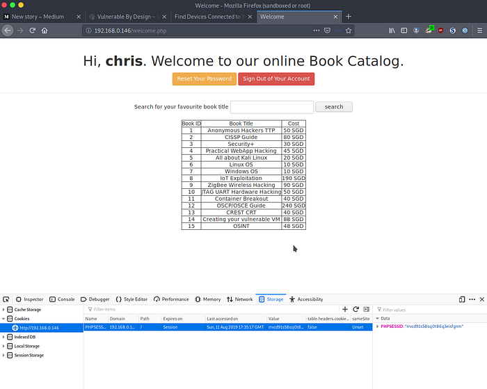 called PHPSESSID with a value of rrvcd91s58ssj0t86q3eisfgnm . I noted these for later use.
