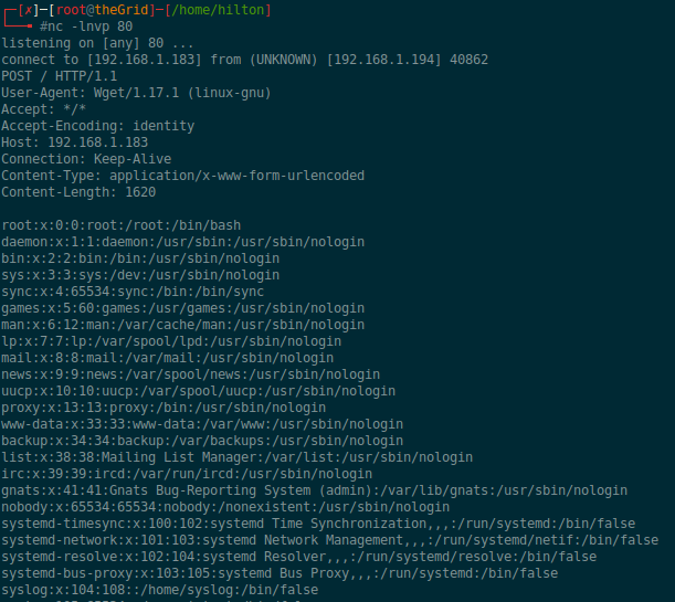 Ok, let’s jump back into this and try to get full root access. First we need to send the passwd file to ourselves!