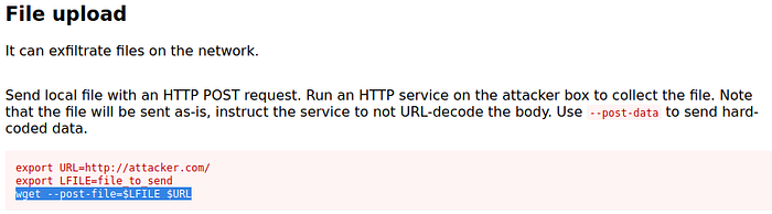As you can see above there is a weird one set on the wget binary. If we check out the GTFOBins site we can get an understanding of how to use wget to exploit it and hopefully give us root privs.