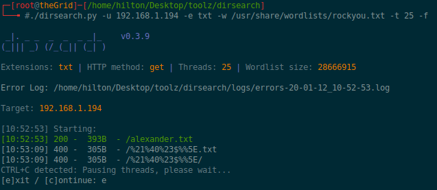 ./dirsearch.py -u 192.168.1.194 -e txt -w /usr/share/wordlists/rockyou.txt -t 25