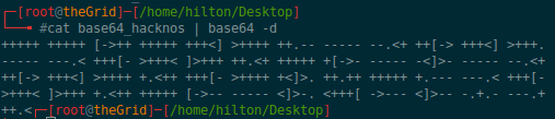 When we decode the string it returns a very strange looking string, but fortunately I have seen similar before and recognize it as the esoteric programming language called Brainf*ck we can use an online interpreter to execute the code and see what the output is.