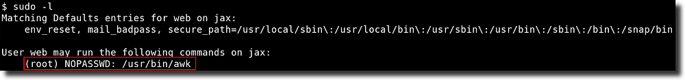 Again, after some basic enumeration checks(SUID, GUID, Kernel exploits, etc), I saw that the awk application had the permission to be executed as SUDO without the SUDO password: