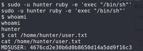 sudo -u hunter ruby -e 'exec "/bin/sh"'Press enter or click to view image in full size