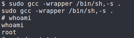 sudo gcc -wrapper /bin/sh,-s .Press enter or click to view image in full size