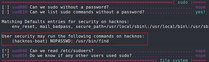 Linux-smart-enumeration is usually my trusty script on any Linux box for local enumeration. I found from LSE output that, the user named security has access to run find command as hackNos-boat. GTFOBins is an awesome project, which can help us in situations involving SUID or sudo misconfigurations. They maintain a curated list of all known attack vectors for Unix binaries. We can use below command to escalate our privileges.