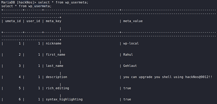 Tip: You need an interactive shell to work with MySQL normally, in restrictive shells use python -c ‘import pty; pty.spawn(“/bin/sh”)’ to spawn an interactive shell.