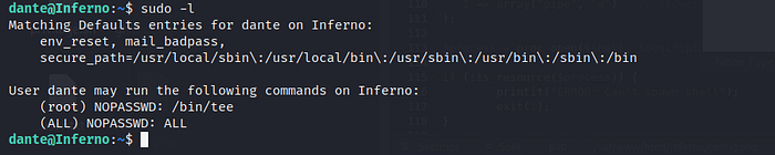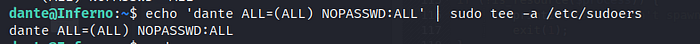 Command: echo ‘dante ALL=(ALL) NOPASSWD:ALL’ | sudo tee -a /etc/sudoers