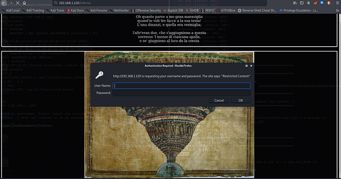 it is a 401 page we are not authorized, and we need to log in, I tried to extract the photos too, I used various techniques to find at least one user, to try to bypass the page, I tried as user dante or inferno, but nothing seems work, the only thing that works is the default user: admin
