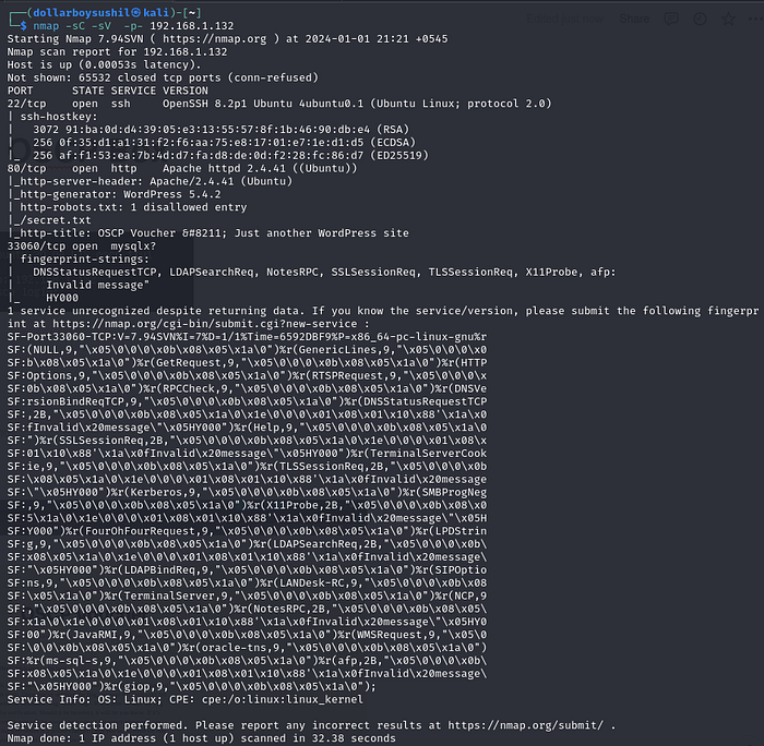 nmap -sC -sV 192.168.1.132-sC for default scripts,-sV for version enumeration and -p- to scan all ports.