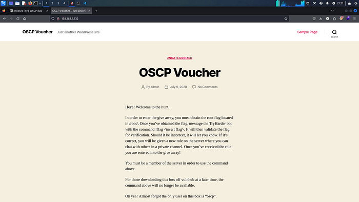 Visiting the ip we can see wordpress site, the key thing to notice from the wordpress site is: The only user on this box is “oscp”