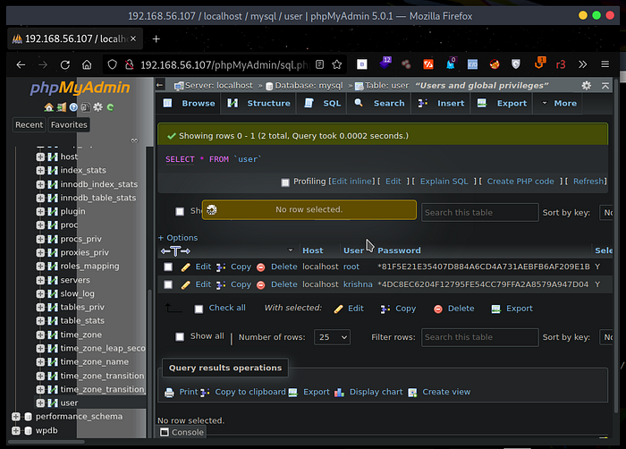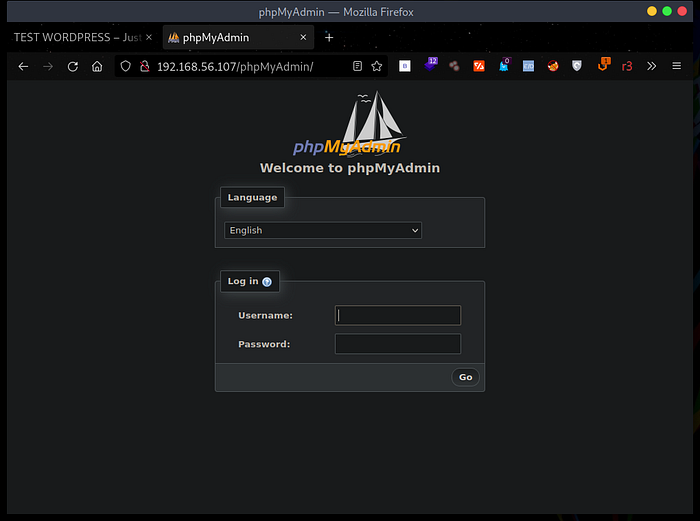 So I decided to access the phpMyAdmin login page on http://192.168.56.107/phpMyAdmin , With a little help from hacktricks I was able to use the login via the sql-login-bypass method with default credential root:root