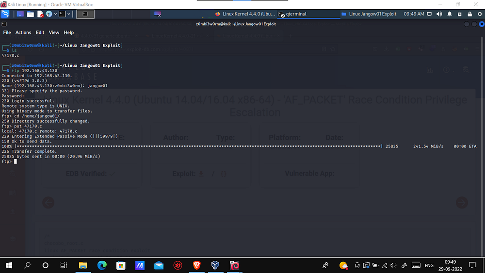 I used the FTP (credentials used to access SSH) to upload the exploit into the machine.