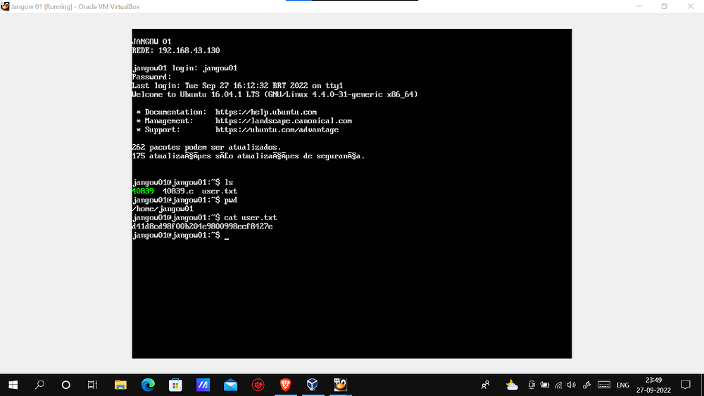 This is were I realized that the database username and password which I found earlier belongs to the username jangow01. So I crosschecked the /etc/passwd file and the wordpress/config.php file. That’s when I has a thought to try the username (jangow01) from the passwd file and the database password (abygurl69) from the config file. It worked out !!! Hooray. I got into the system.